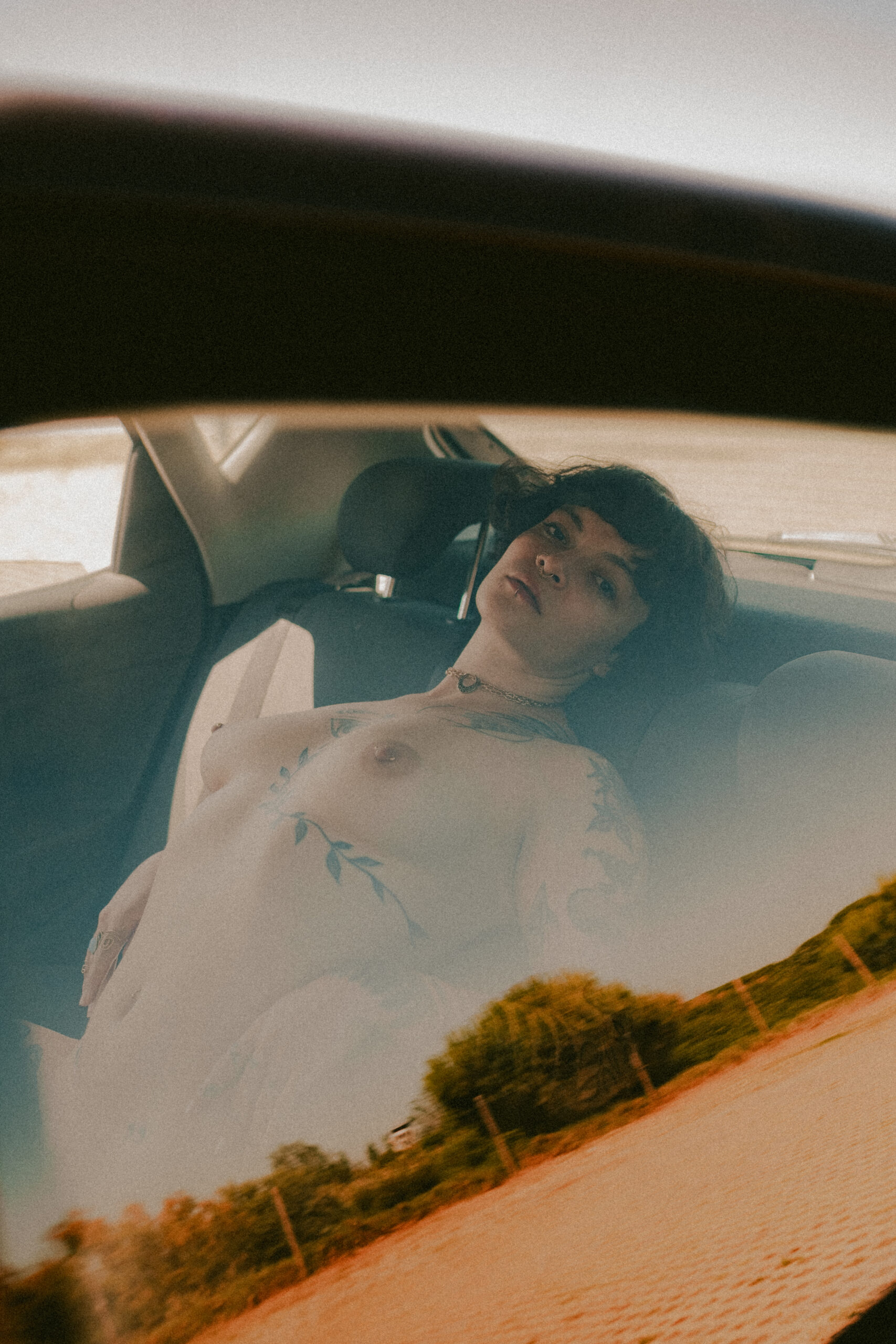 A set of 114 photos. A journey between light and skin. Inside a car, underwear mingles with the warmth of